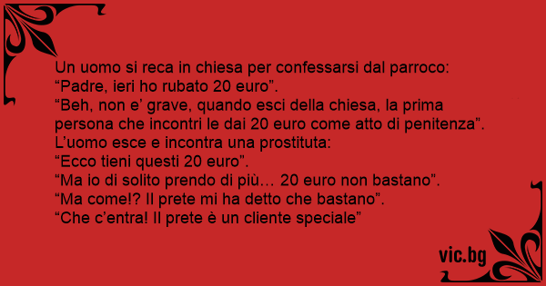 “Beh, non e’ grave, quando esci della chiesa, la prima persona che incontri le dai 20 euro come atto di penitenza”. L’uomo esce e incontra una prostituta: