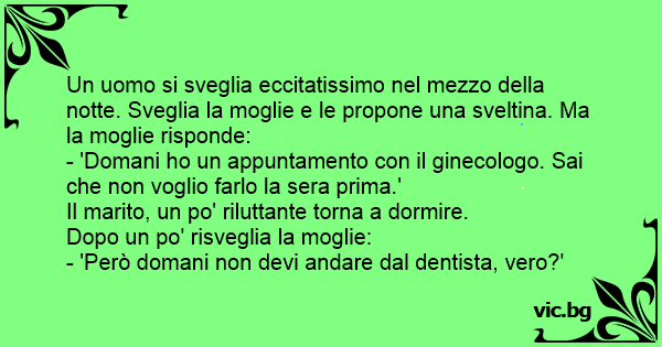 Barbatul:Nevasta, nu ai chef de sex? Nevasta:Nu pot ca maine merg la ginecolog, B: (dupa 5 minute)Da la dentist te duci??