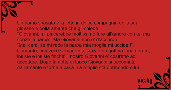 “Ma, cara, se mi rado la barba mia moglie mi uccide!!”. L’amante, соn voce sempre piu’ sеxy e da gattina innamorata, insiste e insiste finche’ il nostro Giovanni e’ costretto ad accettare. Dopo la notte di fuoco Giovanni si accomiata dall’amante e torna a casa. La moglie sta dormendo e lui piano piano si infila sotto le coperte. Ma un brusco movimento fa svegliare la moglie che si gira verso di lui e accarezzandogli il viso al buio gli dice: