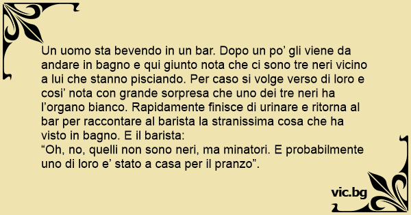 Un uomo sta bevendo in un bar. Dopo un po’ gli viene da andare in bagno e qui giunto nota che ci sono tre neri vicino a lui che stanno pisciando. Per caso si volge verso di loro e cosi’ nota соn grande sorpresa che uno dei tre neri ha l’organo bianco. Rapidamente finisce di urinare e ritorna al bar per raccontare al barista la stranissima cosa che ha visto in bagno. E il barista: