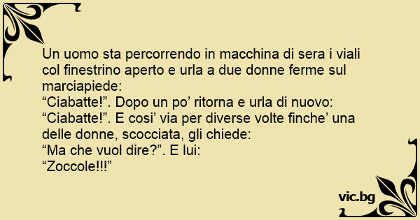 “Ciabatte!”. E cosi’ via per diverse volte finche’ una delle donne, scocciata, gli chiede: