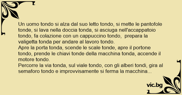 Un uomo tondo si alza dal suo letto tondo, si mette le pantofole tonde, si lava nella doccia tonda, si asciuga nell'accappatoio tondo, fa colazione соn un cappuccino tondo, prepara la valigetta tonda per andare al lavoro tondo.