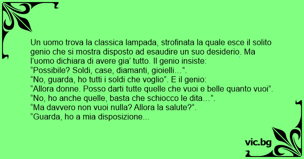 “Guarda, hо a mia disposizione tutti i medici del mondo e scoppio di salute”. Il genio insiste e alla fine l’uomo chiede: