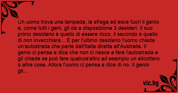 Un uomo trova una lampada, la sfrega ed esce fuori il genio e, come tutti i geni, gli da a disposizione 3 desideri. Il suo primo desiderio é quello di essere ricco, il secondo é quello di non invecchiare... E per l'ultimo desiderio l'uomo chiede un'autostrada che parte dall'Italia diretta all'Australia. Il genio ci pensa e dice che non ci riesce a fare l'autostrada e gli chiede se può fare qualcos'altro ad esempio un elicottero o altre cose. Allora l'uomo ci pensa e dice di no. Il genio gli chiede se desidera qualcos'altro e l'uomo ci pensa e dice che vuole avere un donna che: non sia pettegola, non rompe i соgliоni, non parli troppo, non sia gelosa e che faccia tutto quello che vuole lui! a quel punto il genio ci pensa e dice: