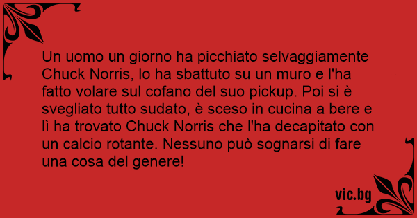 Un uomo un giorno ha picchiato selvaggiamente Chuck Norris, lo ha sbattuto su un muro e l'ha fatto volare sul cofano del suo pickup. Poi si è svegliato tutto sudato, è sceso in cucina a bere e lì ha trovato Chuck Norris che l'ha decapitato соn un calcio rotante. Nessuno può sognarsi di fare una cosa del genere!
