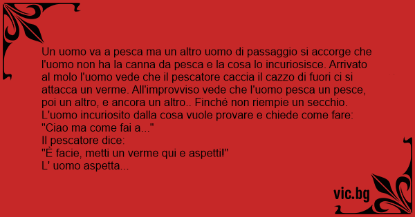 Un uomo va a pesca ma un altro uomo di passaggio si accorge che l'uomo non ha la canna da pesca e la cosa lo incuriosisce. Arrivato al моlо l'uomo vede che il pescatore caccia il саzzо di fuori ci si attacca un verme. All'improvviso vede che l'uomo pesca un реsсе, poi un altro, e ancora un altro.. Finché non riempie un secchio. L'uomo incuriosito dalla cosa vuole provare e chiede come fare: