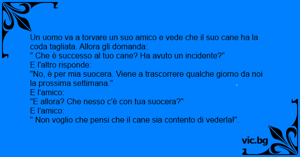 Un uomo va a torvare un suo amico e vede che il suo cane ha la coda tagliata. Allora gli domanda: