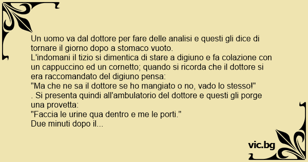 Un uomo va dal dottore per fare delle analisi e questi gli dice di tornare il giorno dopo a stomaco vuoto.