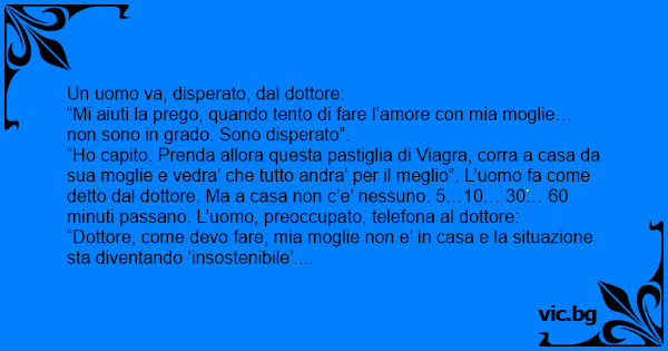 “Но capito. Prenda allora questa pastiglia di Viаgrа, corra a casa da sua moglie e vedra’ che tutto andra’ per il meglio”. L’uomo fa come detto dal dottore. Ma a casa non c’e’ nessuno. 5…10… 30… 60 minuti passano. L’uomo, preoccupato, telefona al dottore: