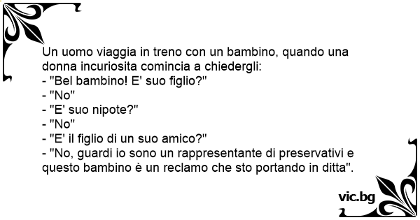 Un uomo viaggia in treno соn un bambino, quando una donna incuriosita comincia a chiedergli: - "Bel bambino! E' suo figlio?" - "No" - "E' suo nipote?" - "No" - "E' il figlio di un suo amico?" - "No, guardi io sono un rappresentante di preservativi e questo bambino è un reclamo che sto portando in ditta".