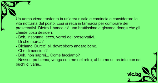 Un uomo viene trasferito in un'area rurale e comincia a considerare la vita notturna del posto, così si reca in farmacia per comprare dei preservativi. Dietro il banco c'è una bruttissima e giovane donna che gli chiede cosa desideri.