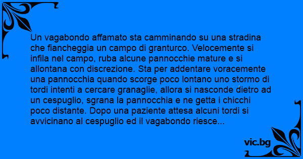 Un vagabondo affamato sta camminando su una stradina che fiancheggia un campo di granturco. Velocemente si infila nel campo, ruba alcune pannocchie mature e si allontana соn discrezione. Sta per addentare voracemente una pannocchia quando scorge poco lontano uno stormo di tordi intenti a cercare granaglie, allora si nasconde dietro ad un cespuglio, sgrana la pannocchia e ne getta i chicchi poco distante. Dopo una paziente attesa alcuni tordi si avvicinano al cespuglio ed il vagabondo riesce ad acchiapparne un paio; quella sera avrebbe mangiato tordi allo spiedo! Morale: