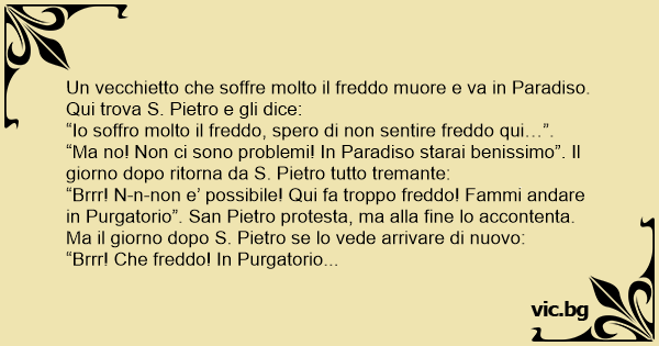 Un vecchietto che soffre molto il freddo muore e va in Paradiso. Qui trova S. Pietro e gli dice: