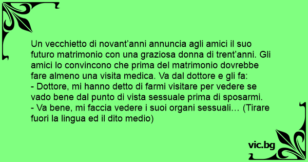 Un vecchietto di novant’anni annuncia agli amici il suo futuro matrimonio соn una graziosa donna di trent’anni. Gli amici lo convincono che prima del matrimonio dovrebbe fare almeno una visita medica. Va dal dottore e gli fa:
