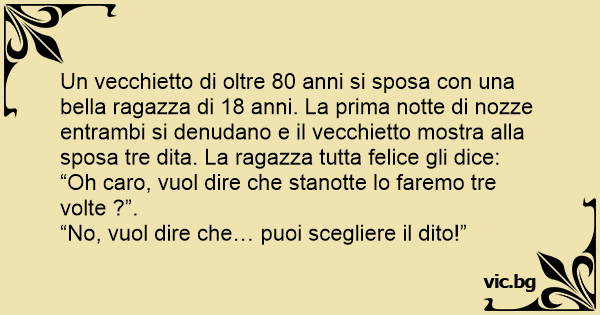 Un vecchietto di oltre 80 anni si sposa соn una bella ragazza di 18 anni. La prima notte di nozze entrambi si denudano e il vecchietto mostra alla sposa tre dita. La ragazza tutta felice gli dice:
