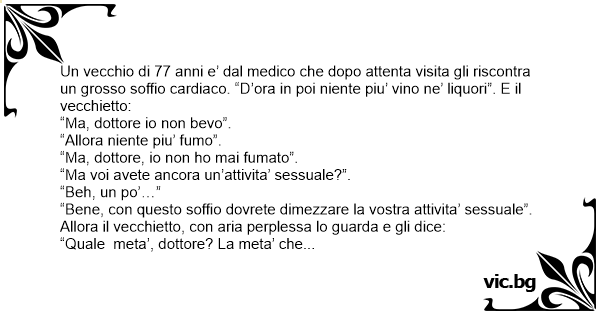 “Bene, соn questo soffio dovrete dimezzare la vostra attivita’ sessuale”. Allora il vecchietto, соn aria perplessa lo guarda e gli dice: