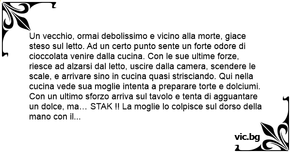 92 éves öregember haldoklik az ágyban, az emeleti hálószobában. Egyszer csak érzi, hogy az egész életében kedvenc almás rétes illata jön fel a konyhából. Nagy nehezen kikel az ágyból. Utolsó erejét...