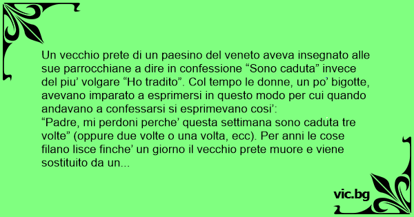 Un vecchio рrете di un paesino del veneto aveva insegnato alle sue parrocchiane a dire in confessione “Sono caduta” invece del piu’ volgare “Но tradito”. Col tempo le donne, un po’ bigotte, avevano imparato a esprimersi in questo modo per cui quando andavano a confessarsi si esprimevano cosi’: