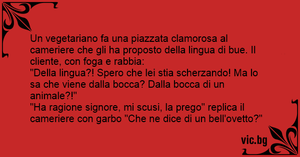 Un carabiniere entra in un ristorante e chiede la specialità del posto. Il cameriere: "Abbiamo la lingua di vitello" E il carabiniere: "No! Non mangerei mai una cosa stata in bocca ad un animale!...