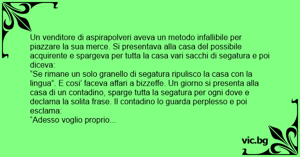 Un venditore di aspirapolveri aveva un metodo infallibile per piazzare la sua merce. Si presentava alla casa del possibile acquirente e spargeva per tutta la casa vari sacchi di segatura e poi diceva:
