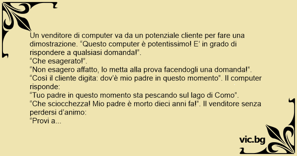 Un venditore di computer va da un potenziale cliente per fare una dimostrazione. “Questo computer è potentissimo! E’ in grado di rispondere a qualsiasi domanda!”.