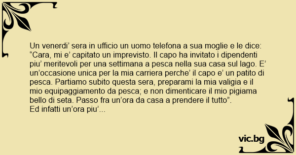 “Cara, mi e’ capitato un imprevisto. Il capo ha invitato i dipendenti piu’ meritevoli per una settimana a pesca nella sua casa sul lago. E’ un’occasione unica per la mia carriera perche’ il capo e’ un patito di pesca. Partiamo subito questa sera, preparami la mia valigia e il mio equipaggiamento da pesca; e non dimenticare il mio pigiama bello di seta. Passo fra un’ora da casa a prendere il tutto”.