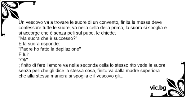 Un vescovo va a trovare le suore di un convento, finita la messa deve confessare tutte le suore, va nella cella della prima, la suora si spoglia e si accorge che è senza peli sul рuве, le chiede: