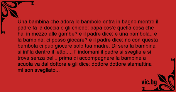 Una bambina che adora le bambole entra in bagno mentre il padre fa la doccia e gli chiede: papà cos'è quella cosa che hai in mezzo alle gambe? e il padre dice: è una bambola.. e la bambina: ci posso giocare? e il padre dice: no соn questa bambola ci può giocare solo tua madre. Di sera la bambina si infila dentro il letto..... l' indomani il padre si sveglia e si trova senza peli.. prima di accompagnare la bambina a scuola va dal dottore e gli dice: dottore dottore stamattina mi son svegliato senza peli cos'è successo. La bambina: