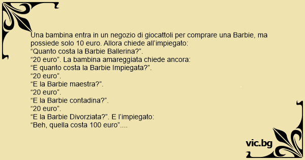 Una bambina possiede 10 euro ed entra in un negozio di bambole e dice: - "Quanto costa la barbie ballerina?" - "20 euro" - "E quella nuotatrice?" - "20 euro" - "Quella spagnola?" - "20 euro" - "E...
