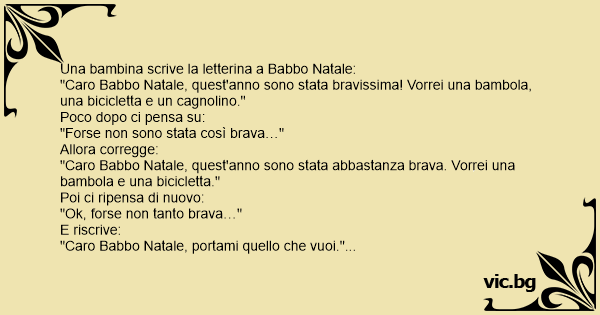 "Caro Babbo Natale, quest'anno sono stata bravissima! Vorrei una bambola, una bicicletta e un cagnolino."
