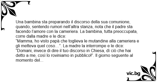 “Domani, invece di dire il tuo discorso in Chiesa, dì ciò che hai detto a me, così lo roviniamo in pubblico!”. Il giorno seguente al momento del discorso l’innocente creatura dice “Но visto papà che toglieva le mutandine alla cameriera e gli metteva quel coso, quel coso… Mamma, come si chiama quel coso che il postino ti mette in bocca ogni volta che viene a casa?”.