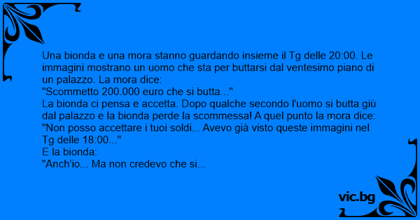 La bionda ci pensa e accetta. Dopo qualche secondo l'uomo si butta giù dal palazzo e la bionda perde la scommessa! A quel punto la mora dice: