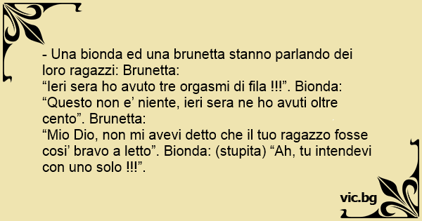 Una bionda e una bruna stanno discutendo dei loro ragazzi: Bruna: ‘L’altra notte ho avuto *tre* orgasmi in fila!’. Bionda: ‘Questo è niente; l’altra notte ne ho avuti più di cento’. Bruna: ‘Mio...