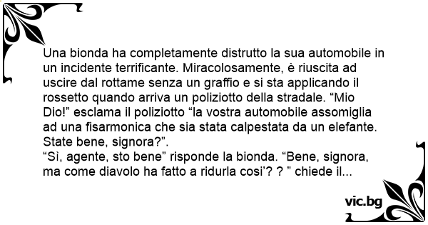 Una bionda ha completamente distrutto la sua automobile in un incidente terrificante. Miracolosamente, è riuscita ad uscire dal rottame senza un graffio e si sta applicando il rossetto quando arriva un poliziotto della stradale. “Mio Dio!” esclama il poliziotto “la vostra automobile assomiglia ad una fisarmonica che sia stata calpestata da un elefante. State bene, signora?”.