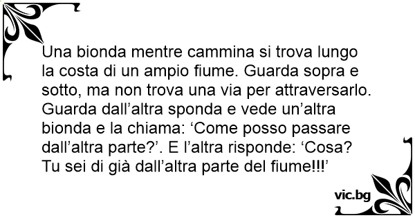 Una bionda mentre cammina si trova lungo la costa di un ampio fiume. Guarda sopra e sotto, ma non trova una via per attraversarlo. Guarda dall’altra sponda e vede un’altra bionda e la chiama: ‘Come posso passare dall’altra parte?’. E l’altra risponde: ‘Cosa? Tu sei di già dall’altra parte del fiume!!!’