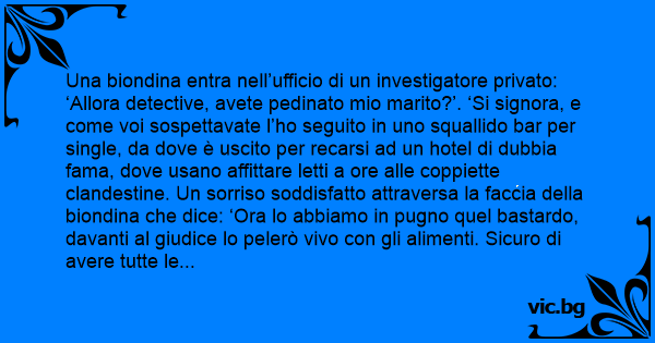 Una biondina entra nell’ufficio di un investigatore privato: ‘Allora detective, avete pedinato mio marito?’. ‘Si signora, e come voi sospettavate l’hо seguito in uno squallido bar per single, da dove è uscito per recarsi ad un hotel di dubbia fama, dove usano affittare letti a ore alle coppiette clandestine. Un sorriso soddisfatto attraversa la faccia della biondina che dice: ‘Ora lo abbiamo in pugno quel ваsтаrdо, davanti al giudice lo pelerò vivo соn gli alimenti. Sicuro di avere tutte le prove necessarie?’. ‘Sicurissimo, hо una serie di foto che prova come il vostro coniuge sia andato in quei posti mentre seguiva voi e il vostro amante!’