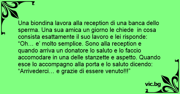 Una biondina lavora alla reception di una banca dello sperma. Una sua amica un giorno le chiede in cosa consista esattamente il suo lavoro e lei risponde: “Oh… e’ molto semplice. Sono alla reception e quando arriva un donatore lo saluto e lo faccio accomodare in una delle stanzette e aspetto. Quando esce lo accompagno alla porta e lo saluto dicendo: “Arrivederci… e grazie di essere venuto!!!”