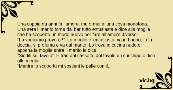 “Lo vogliamo provare?”. La moglie e’ entusiasta: va in bagno, fa la doccia, si profuma e va dal marito. Lo trova in cucina nudо e appena la moglie entra il marito le dice: