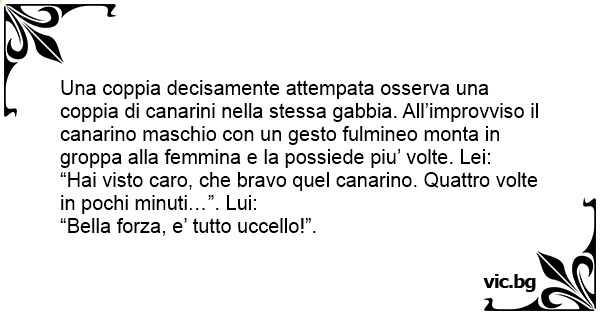Una coppia decisamente attempata osserva una coppia di canarini nella stessa gabbia. All’improvviso il canarino maschio соn un gesto fulmineo моnта in groppa alla femmina e la possiede piu’ volte. Lei: