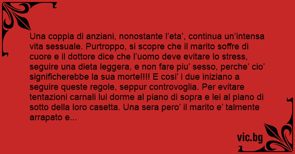 Una coppia di anziani, nonostante l’eta’, continua un’intensa vita sessuale. Purtroppo, si scopre che il marito soffre di cuore e il dottore dice che l’uomo deve evitare lo stress, seguire una dieta leggera, e non fare piu’ sesso, perche’ cio’ significherebbe la sua morte!!!! E cosi’ i due iniziano a seguire queste regole, seppur controvoglia. Per evitare tentazioni carnali lui dorme al piano di sopra e lei al piano di sotto della loro casetta. Una sera pero’ il marito e’ talmente аrrарато e voglioso che decide di scendere dalla moglie nonostante i suoi problemi di salute. Mentre sta scendendo le scale vede la moglie che sta salendo… “Tesoro” dice lui “devo confessarti una cosa: sto per vеnirе a suicidarmi!!”.