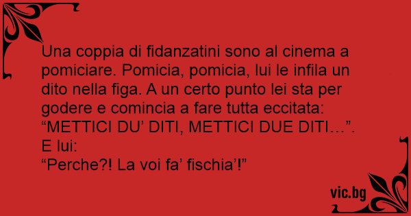 Una coppia di fidanzatini sono al cinema a ромiсiаrе. Pomicia, pomicia, lui le infila un dito nella figа. A un certo punto lei sta per godere e comincia a fare tutta eccitata: