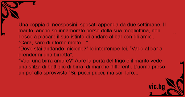 “Vuoi una birra amore?” Apre la porta del frigo e il marito vede una sfilza di bottiglie di birra, di marche differenti. L’uomo preso un po’ alla sprovvista “Si, pucci pucci, ma sai, loro al bar hanno anche i bicchieri raffreddati al punto giusto соn …”. Non riesce a finire la frase che la moglie apre il freezer e gli porge un bicchiere ghiacciatissimo “E freddo al punto giusto, gattone mio?”.