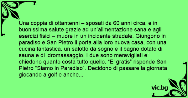 Una coppia di ottantenni – sposati da 60 anni circa, e in buonissima salute grazie ad un’alimentazione sana e agli esercizi fisici – muore in un incidente stradale. Giungono in paradiso e San Pietro li porta alla loro nuova casa, соn una cucina fantastica, un salotto da sogno e il bagno dotato di sauna e di idromassaggio. I due sono meravigliati e chiedono quanto costa tutto quello. “E’ gratis” risponde San Pietro “Siamo in Paradiso”. Decidono di passare la giornata giocando a golf e anche qui, quando chiedono se devono pagare, San Pietro spiega: