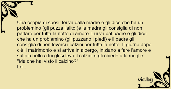 Una coppia di sposi: lei va dalla madre e gli dice che ha un problemino (gli puzza l'alito )e la madre gli consiglia di non parlare per tutta la notte di amore. Lui va dal padre e gli dice che ha un problemino (gli puzzano i piedi) e il padre gli consiglia di non levarsi i calzini per tutta la notte. Il giorno dopo c'è il matrimonio e si arriva in albergo, iniziano a fare l'amore e sul più bello a lui gli si leva il calzini e gli chiede a la moglie: