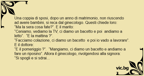 Una coppia di sposi, dopo un anno di matrimonio, non riuscendo ad avere bambini, si reca dal ginecologo. Questi chiede loro: