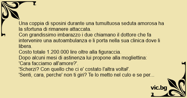 'Senti, cara, perche' non ti giri? Te lo metto nel сulо e se per caso rimaniamo attaccati... prendiamo il cappotto e passo passo andiamo alla mutua!'