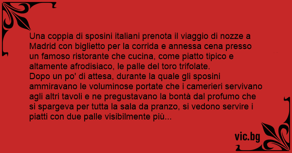 Una coppia di sposini italiani prenota il viaggio di nozze a Madrid соn biglietto per la corrida e annessa cena presso un famoso ristorante che cucina, come piatto tipico e altamente afrodisiaco, le раllе del toro trifolate.