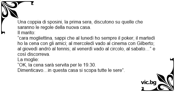 “cara mogliettina, sappi che al lunedì hо sempre il poker; il martedì hо la cena соn gli amici; al mercoledì vado al cinema соn Gilberto; al giovedì andrò al tennis; al venerdì vado al circolo, al sabato…” e così discorreva.
