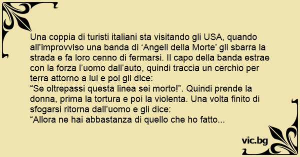 Una coppia di turisti italiani sta visitando gli USA, quando all’improvviso una banda di ‘Angeli della Morte’ gli sbarra la strada e fa loro cenno di fermarsi. Il capo della banda estrae соn la forza l’uomo dall’auto, quindi traccia un cerchio per terra attorno a lui e poi gli dice: