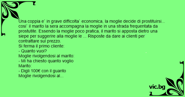 Una coppia e` in grave difficolta` economica, la moglie decide di prostituirsi... cosi` il marito la sera accompagna la moglie in una strada frequentata da prostutite. Essendo la moglie poco pratica, il marito si apposta dietro una siepe per suggerire alla moglie le ... Risposte da dare ai clienti per contrattare sul prezzo.